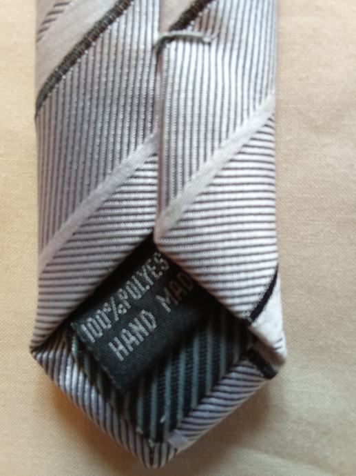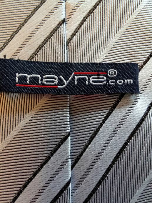 Prodajem rabljenu mušku kravatu marke Mayne.com elegantnog dizajna sa sivim i bež prugama. Kravata je ručno rađena i savršen je modni dodatak za svaku formalnu priliku.