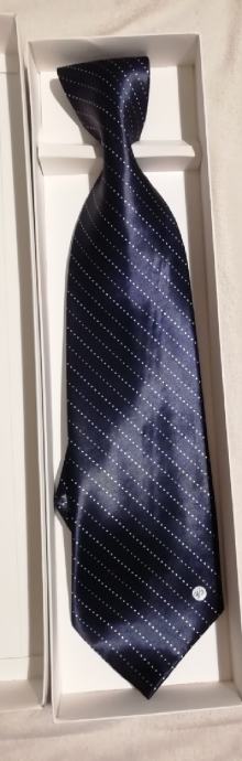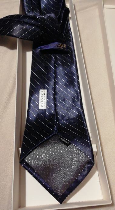 Tamno plava sa bijelim i krem tockicama je nosena. Etiketa na samoj kravati se odsila vecim dijelom. Marka Versace.