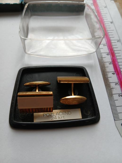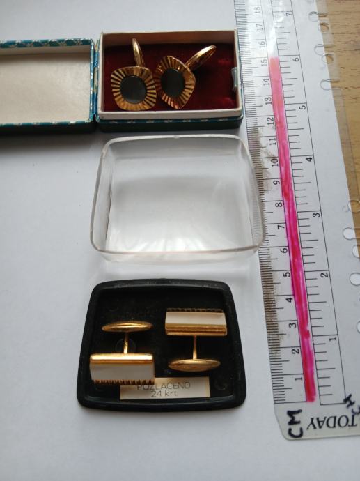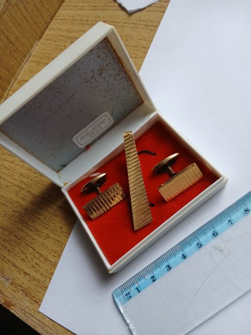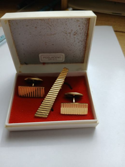 Manžete za kosulju i igla za kravatu sve na slikama Zlatarne Celje poznata 24 kt nekoristeno prvi komplet totalna poznata drugi poznata sa sedefnim umetcima.Cijena je za oba kompleta.Dostavljam isključivo HP pouzećem uz osigurninu i tracking broj.