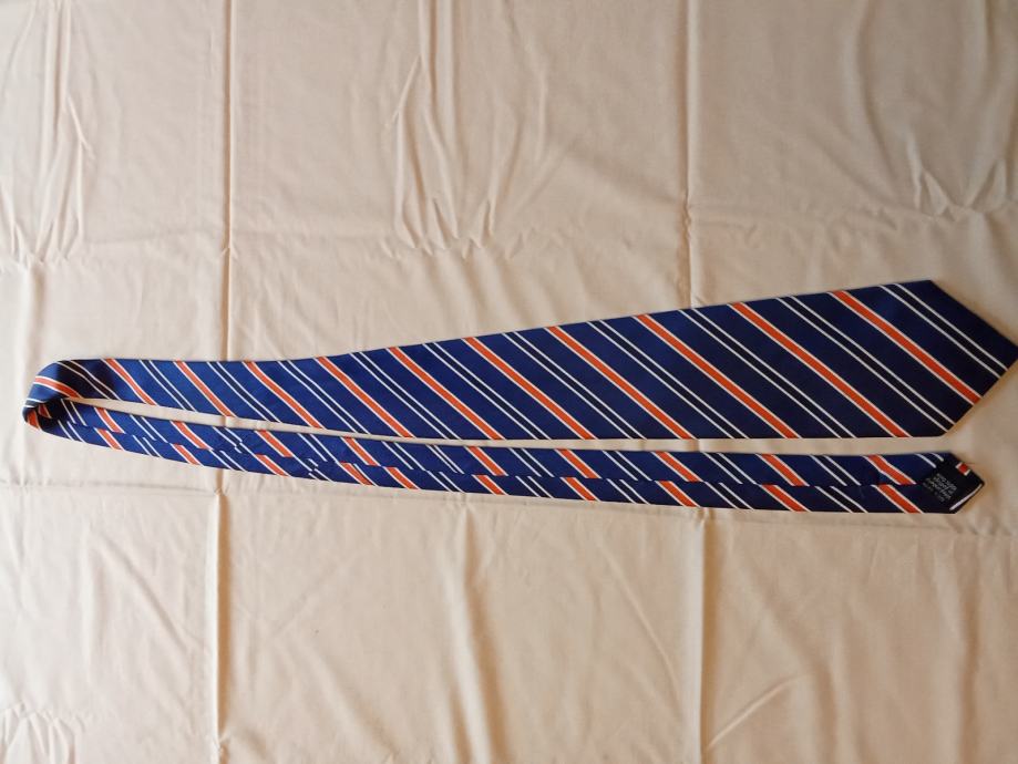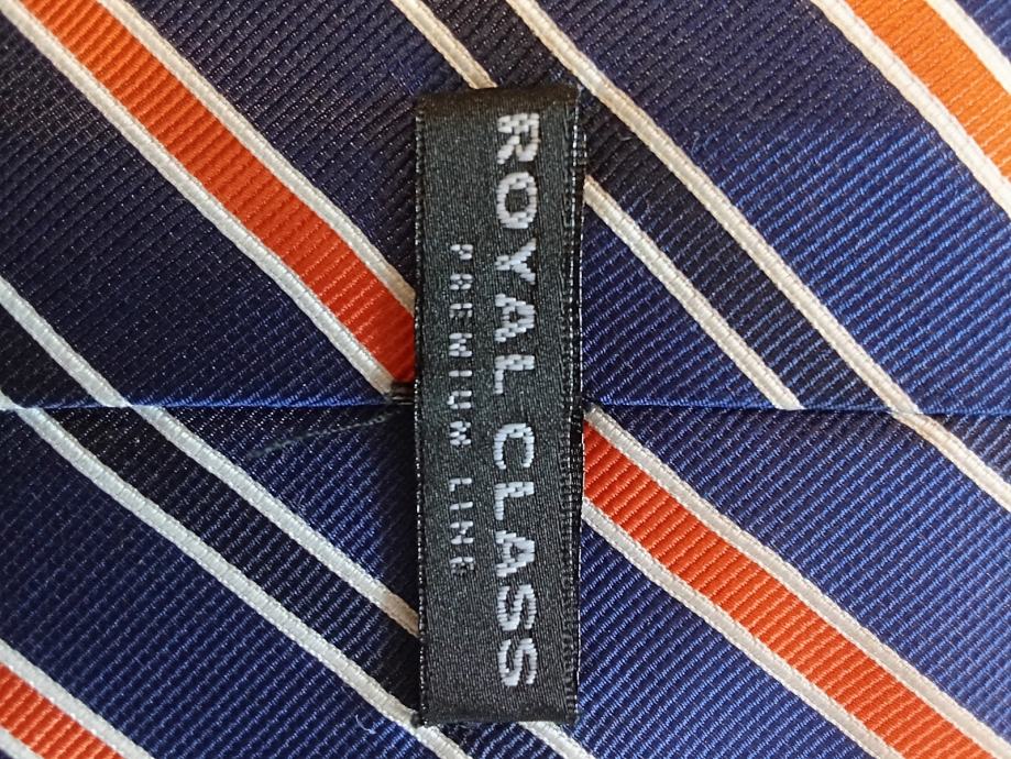 Prodajem elegantnu svilenu kravatu s uzorkom plavih i narančastih pruga. Royal Class premium kravata je rabljena, ali u dobrom stanju. Savršen modni dodatak za poslovne ili svečane prilike.