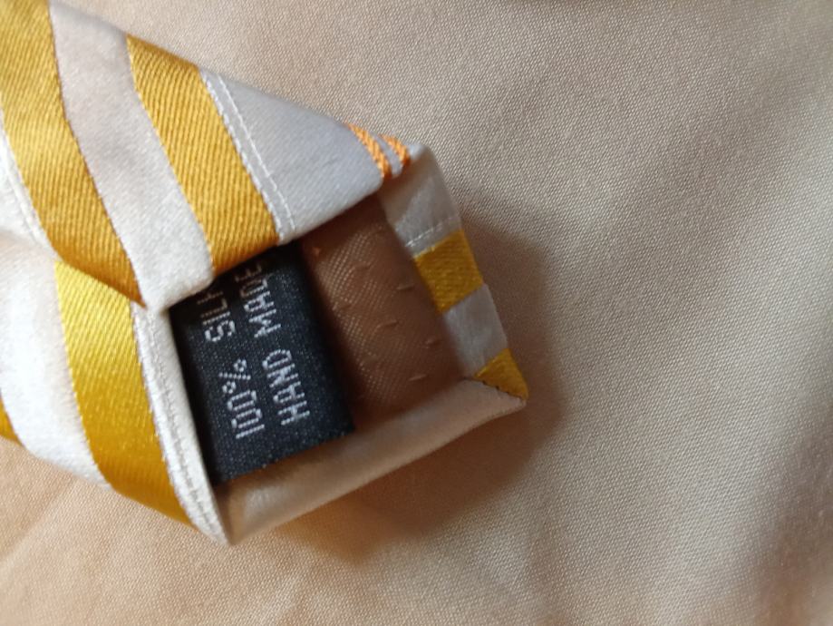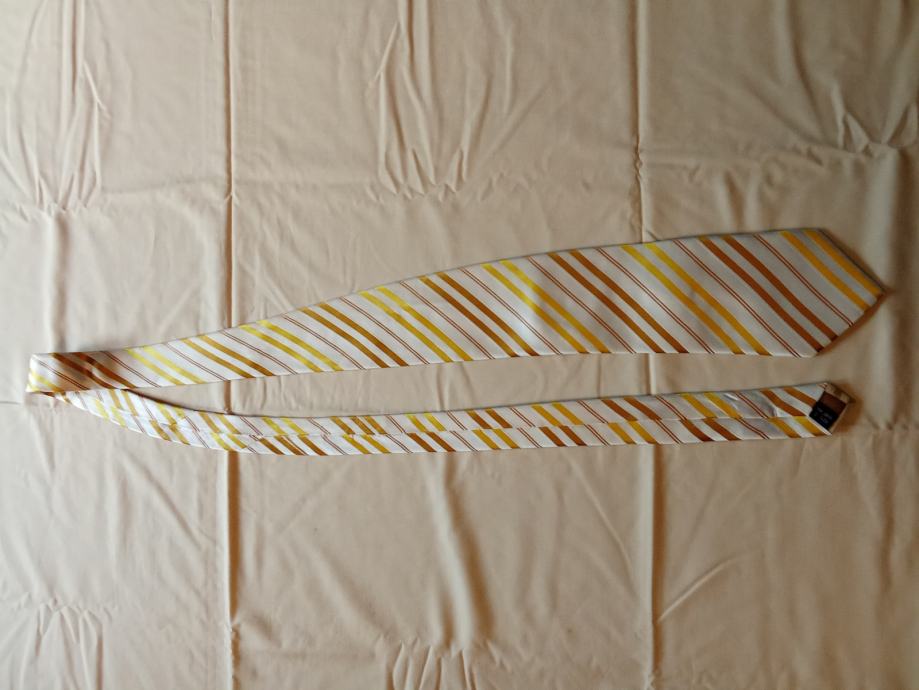 Prodajem elegantnu svilenu kravatu s atraktivnim prugastim uzorkom u žutim i bijelim tonovima. Kravata je rabljena ali dobro očuvana, izrađena od 100% svile. Savršen modni dodatak za poslovne kombinacije ili svečane prilike.