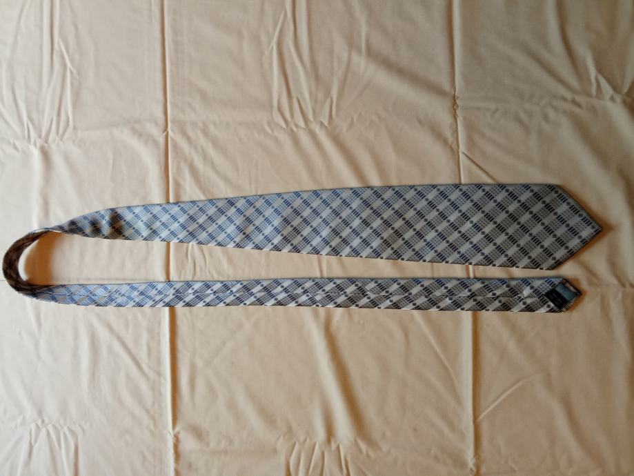 Elegantna svilena kravata s klasičnim kariranim uzorkom u sivoj i plavoj boji. Rabljeno ali očuvano stanje, izrađena od kvalitetne svile. Savršen dodatak za poslovne ili svečane prilike.