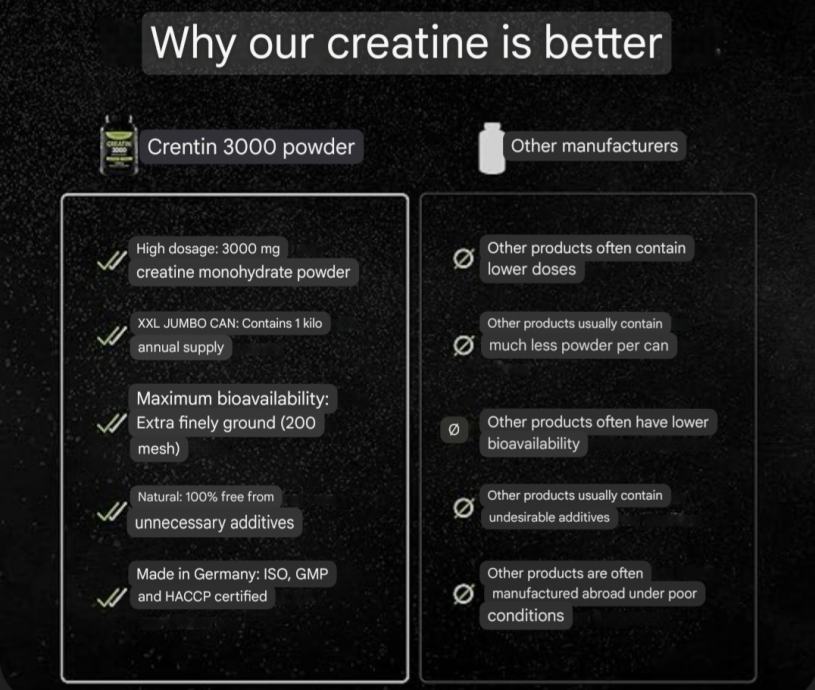 - Kreatin 3000 u prahu: visoka doza i vrhunske kvalitete s mesh faktorom 200 (maksimalna bioraspoloživost). 1000 g čistog kreatin monohidrata u prahu. Veganski i bez aditiva