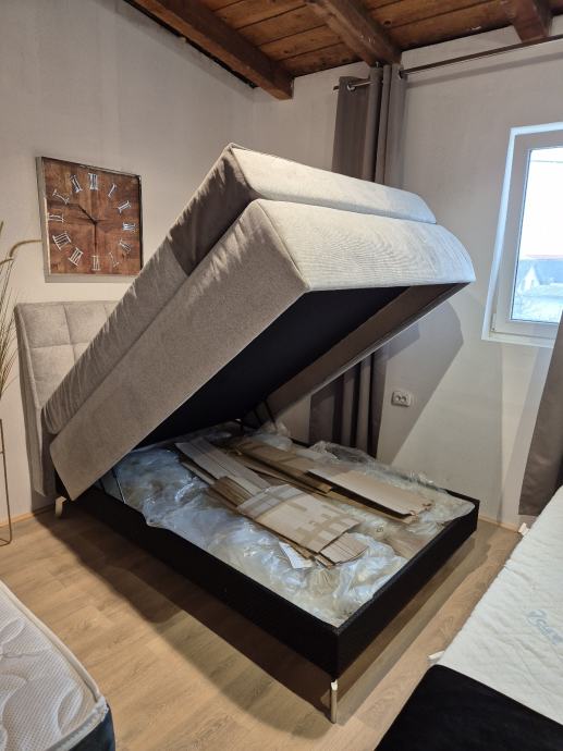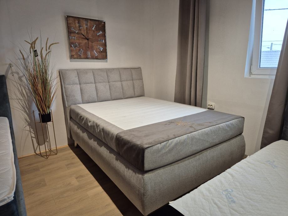 Novi u original pakiranju boxspring krevet s kutijom za posteljinu u dimenziji 120x200 u sv.sivom stofu ( slika iz priloga) dostupan odmah sa skladišta. Sastoji se od boxspring baze od punog drva, te bonell jezgre i protukliznom podlogom. Madrac je vrhunska 7 zonska đepičasta jezgra sa pjenom tapaciran u štof kao na krevetu. Visina ležaja bez nadmadraca je cca 70 cm. Visina uzglavlja cca 126 cm. Kutija za posteljinu se otvara frontalno. Mogućnost dostave, unosa i montaže prema dogovoru. Za sva dodatna pitanja molim zovite na 091/1975-711 ili pišite na info@internoconcept.hr.