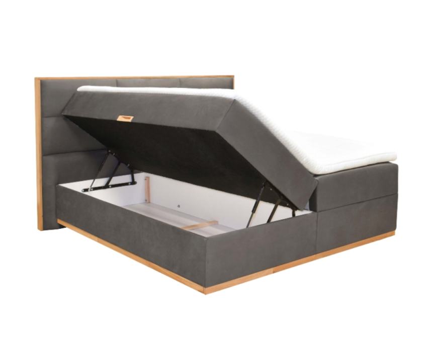 Za boxspring krevet MAGNUM dizajnirano je uzglavlje koje je spoj modernog i rustikalnog– visoko uzglavlje ravnih linija sa tapacirungom smještenim unutar aplikacija od punog hrastovog drveta uljenog bezbojnim uljem.