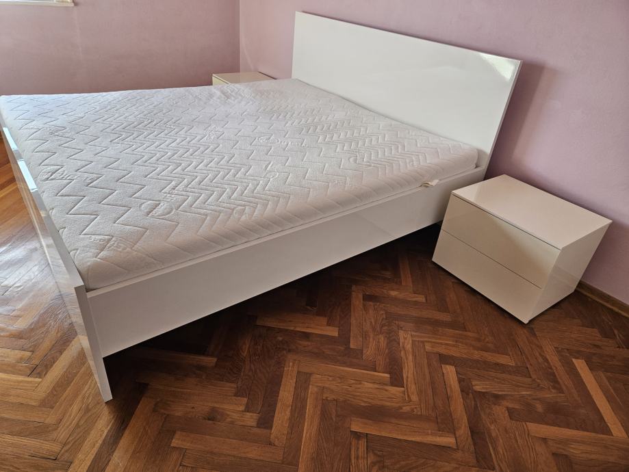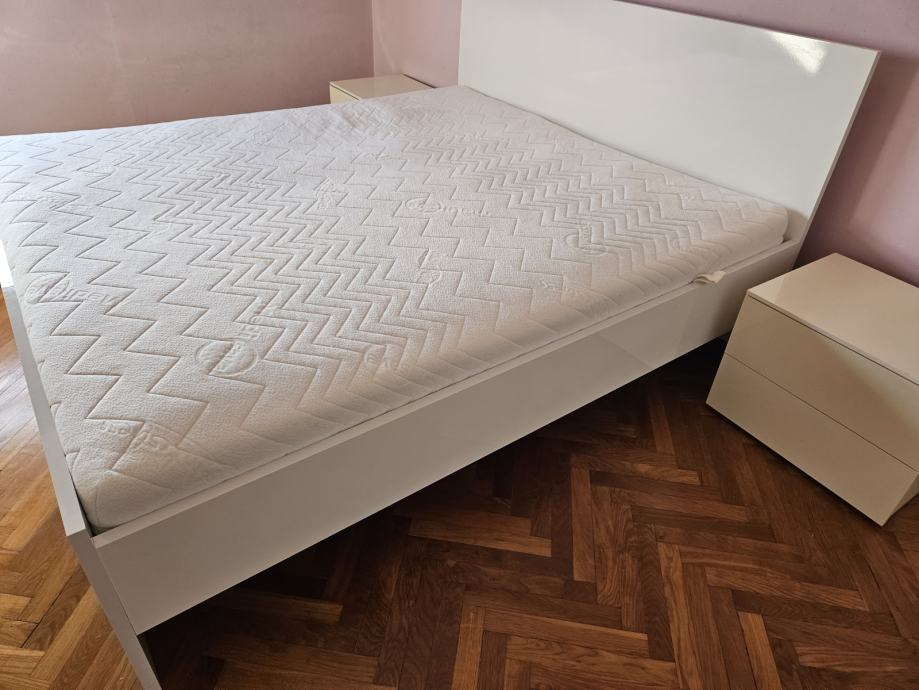 Prodajem očuvanu bračnu sobu bijela boja visoki sjaj. Krevet rađen po mjeri čvrst i kvalitetan 185 širina