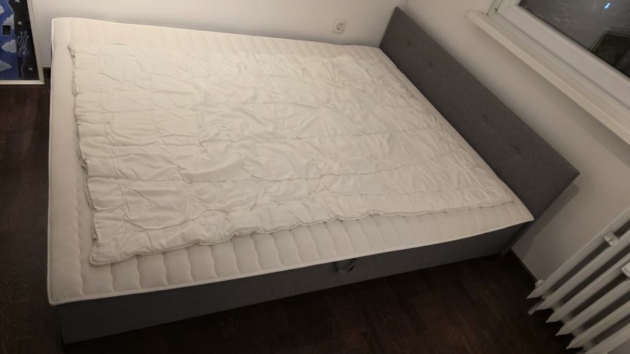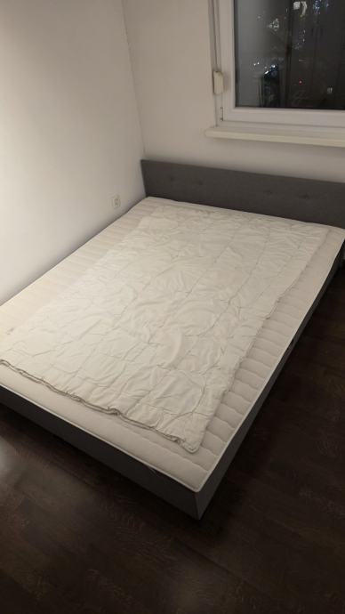 Bračni krevet, nekorišten, madrac, podnice, visoko uzglavlje.