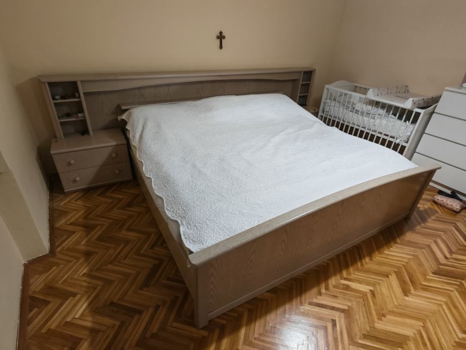 Bračni krevet, očuvan, dimenzije 214 x 207 cm, sa pripadajućim ormarićima, latoflexima