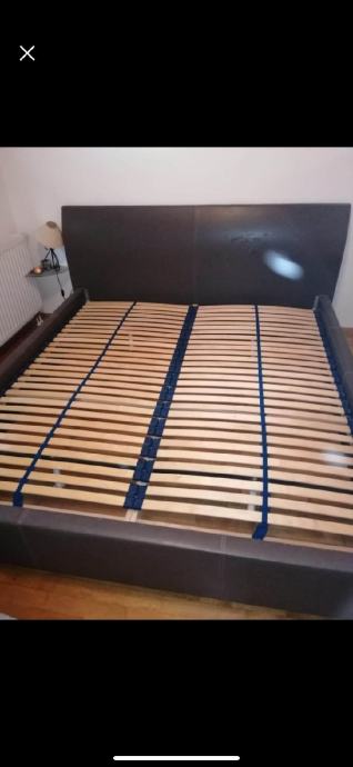 Bračni krevet, tamno smeđi drveni okvir 200x200 cm, sa podnicama.