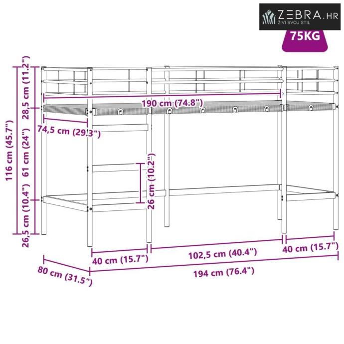 Metalna konstrukcija: Okvir kreveta je od metala, što ga čini jakim i stabilnim. Praškom obložen zaštitni sloj ne samo da izgleda odlično, već štiti od ogrebotina i habanja, pa će trajati godinama u živahnim dječjim sobama.