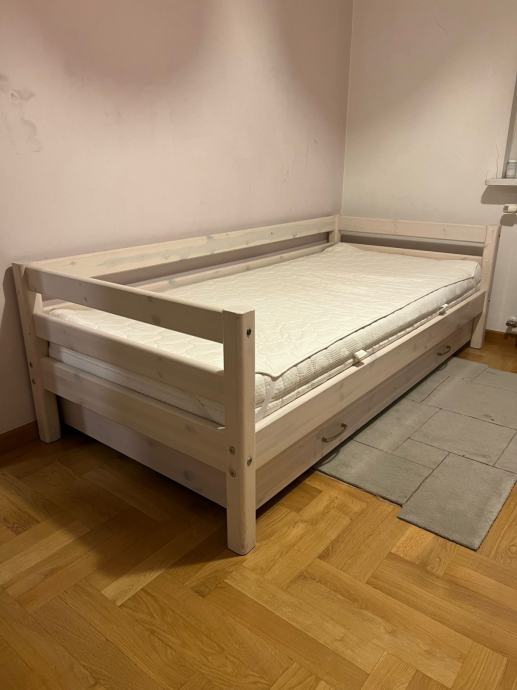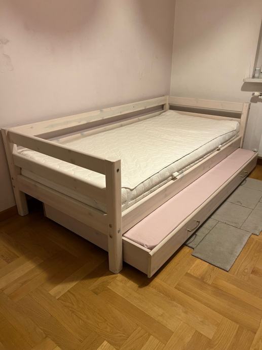 Prodajem FLEXA krevet dimenzija 100x200 s ogradom s tri strane + dodatni/pomoćni ležaj (90x190) ispod glavnog kreveta. Očuvano. Madrac glavnog kreveta nije uključen.