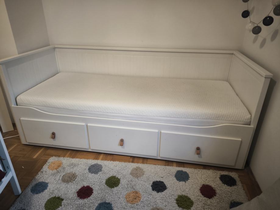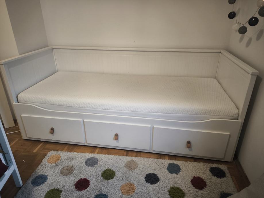 Krevet Hemnes Ikea - kupljen prije dvije godine, ali ga više ne koristimo. Promijenjene ručke u kožne iz Ikee. Madrac poklanjamo (Jysk - preudoban). Od 29. 12. će biti rastavljen zbog lakšeg prijevoza.