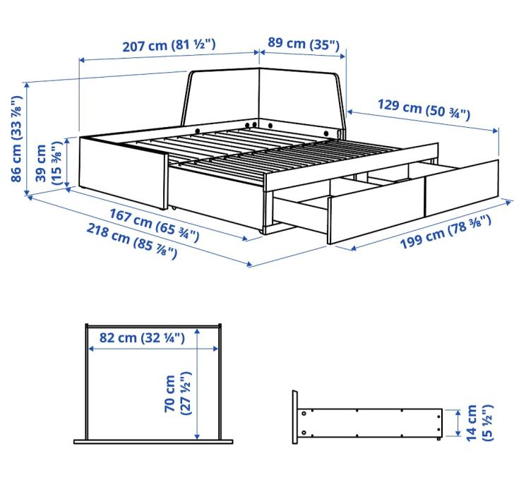 Madraci su 80x 190, krevet kad je sklopljen nema nedostataka,u koliko se razvuče u bračni nedostaju dvije podnice ali i dalje funkcionira,ima dvije ladice za posteljinu