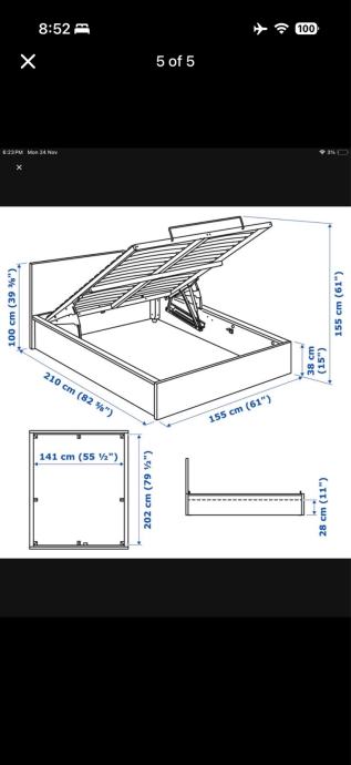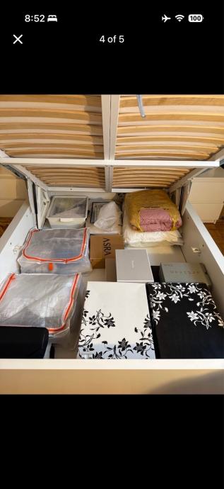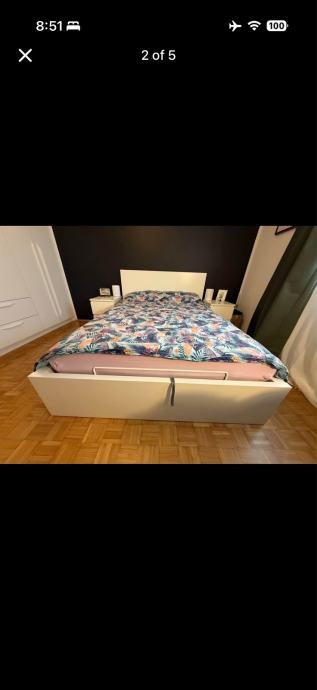 Krevet je također u super stanju, bez oštećenja, sa podiznim mehanizmom i spremišnim prostorom ispod. Dimenzije kreveta su kao na slici (preuzeto sa Ikeinog weba). Prodaju se isključivo radi zamjene za veći krevet (kupujemo isto, samo 20 cm šire :) ).