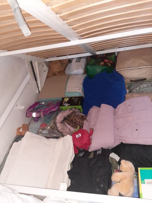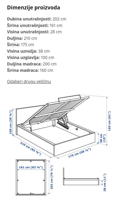 Lako je pristupiti stvarima ispod kreveta , jer je mehanizam odličan ,jednostavno se povuće traka i osnova kreveta se podiže lako. Kod nas je trenutno pola spremnika zauzeto ,zaista ima mjesta za puko toga.Demontaża je Vaša ili po dogovoru.
