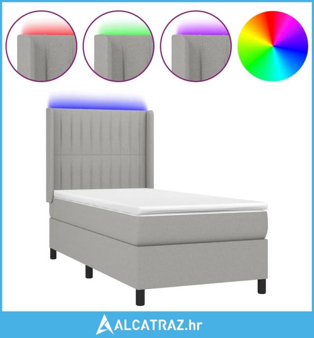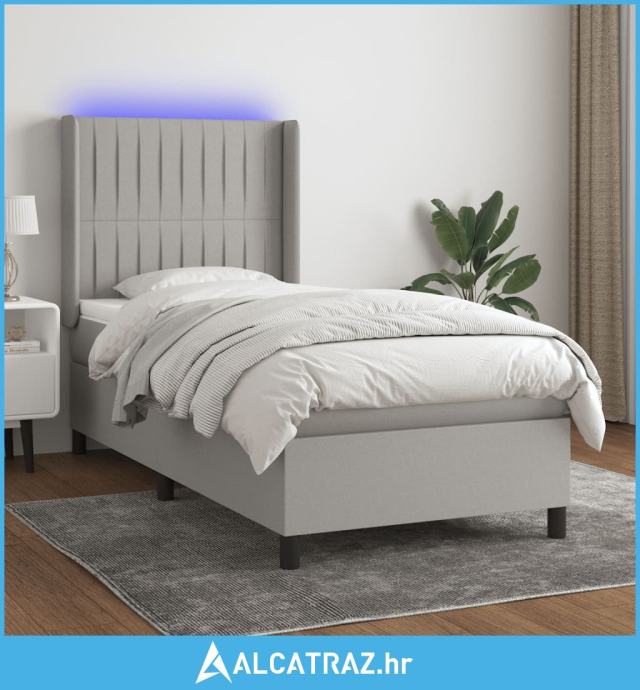 Krevet box spring s madracem LED svjetlosivi 90x200 cm tkanina - NOVO