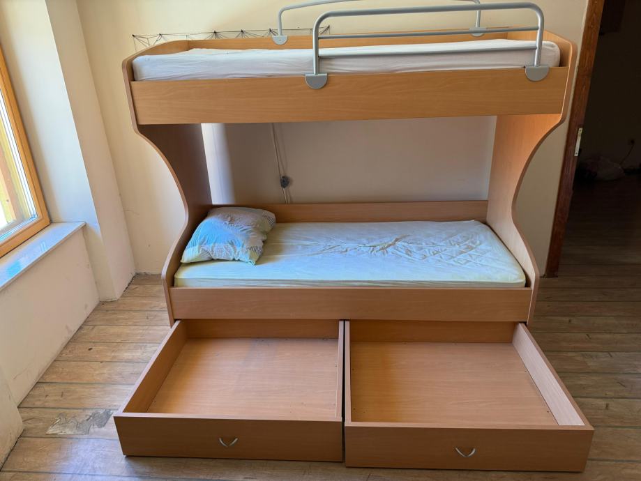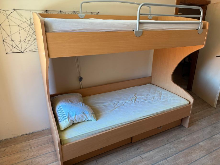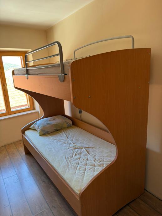 Prodajem očuvan krevet na kat Alples. Krevet je vrlo kvalitetan i stabilan, uz njega dolaze i madraci u dimenzijama 90x200 cm. Dolazi naravno sa metalnim skalama i 2 velika ladičara za spremanje robe ili sličnoga. Kontakt: 0958762051