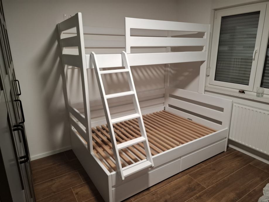Krevet na kat Family sa podnicama i opcijom trećeg ležaja od masiva bukve u dimenzijama 200/190 x 120, 140, 160, 180 za donji krevet i gornji 200/190 x 80, 90, 120.