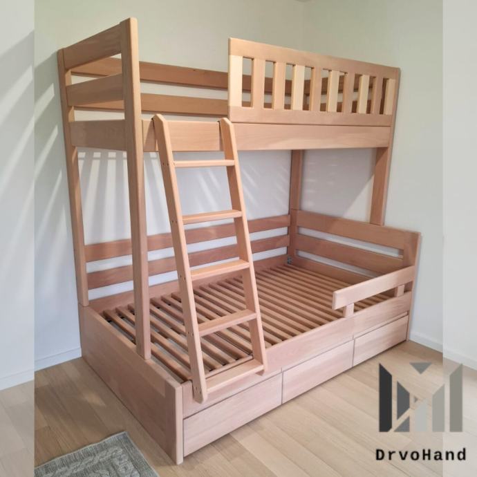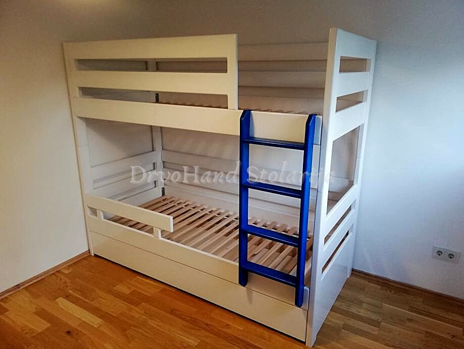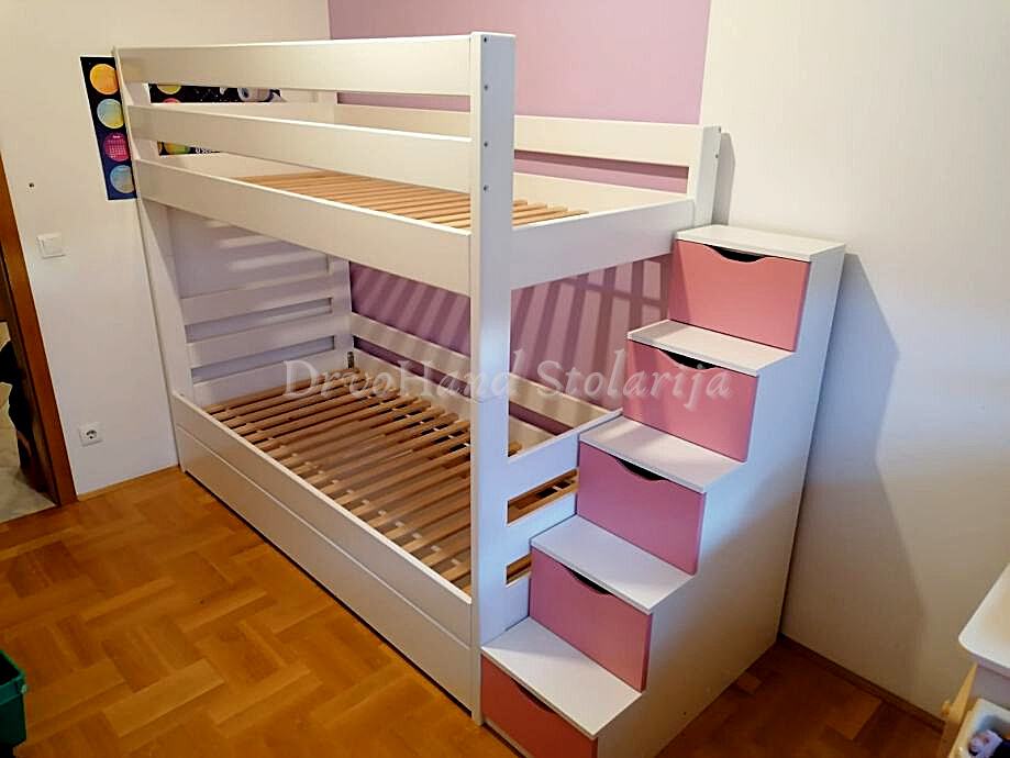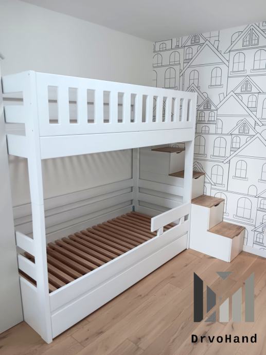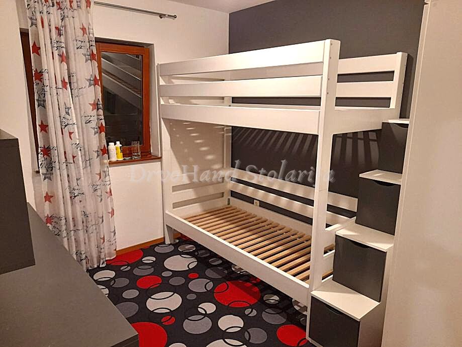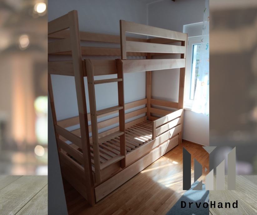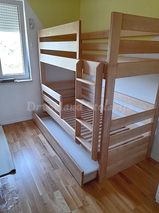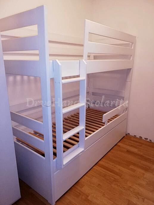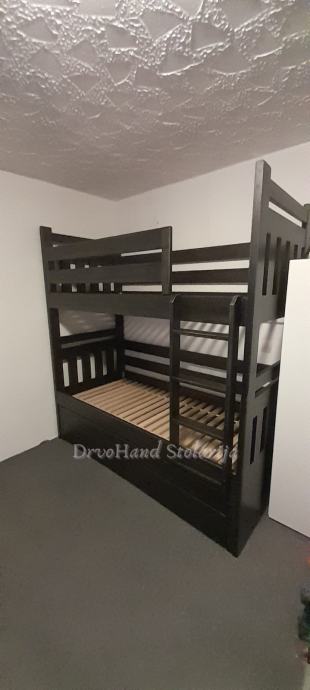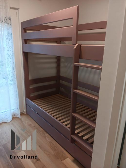Završna obrada PU boje i lakovi, bajcevi u dimenzijama 200/190 x 90/80 sa ladicom i razmaku gornjeg i donjeg kreveta 90 cm je od 1200€