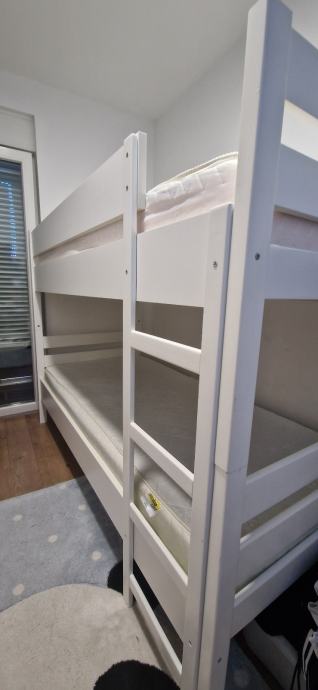Prodajem krevet na kat bijele boje s drvenim okvirom. Krevet dolazi s ljestvama za pristup gornjem ležaju te zaštitnom ogradicom. Uz krevet su uključeni i madraci. Konstrukcija je čvrsta i stabilna.
