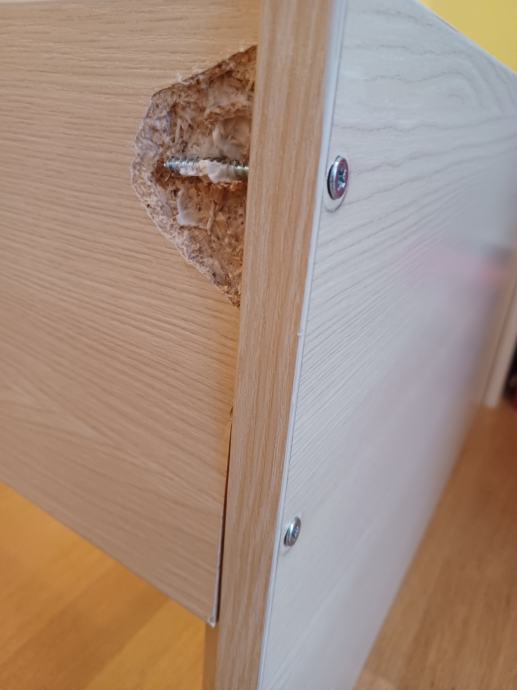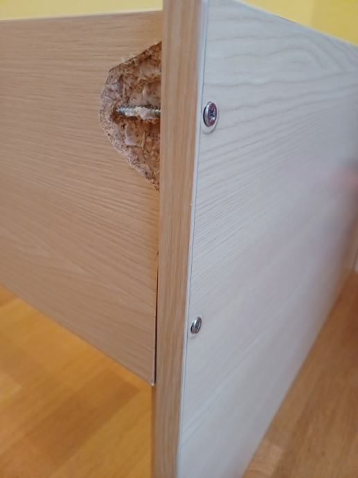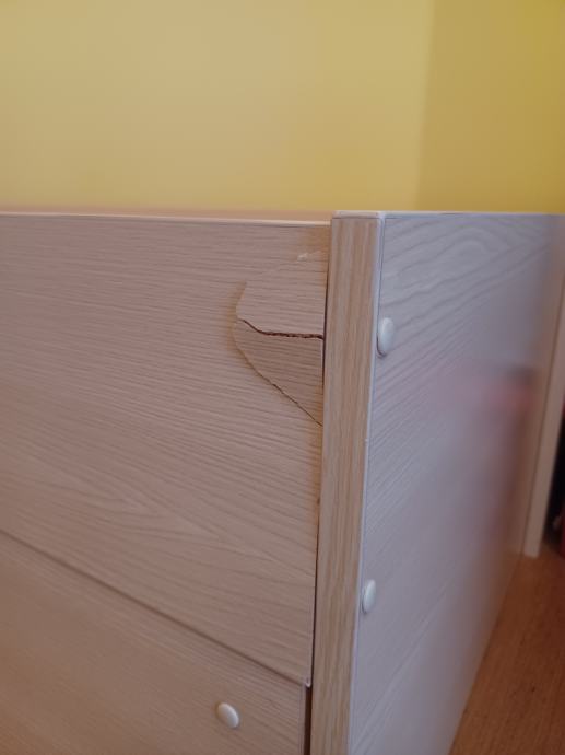 Napomena: Prisutno je oštećenje na jednoj bočnoj dasci okvira kreveta (vidljivo na slici) gdje se šaraf rasklimao uslijed čega se odvojio dio. Taj komad je sačuvan (vidljivo na slici) i može se natrag zalijepiti za bolji estetski dojam, dok bi se premještanjem šarafa na novu poziciju daske mogle normalno i čvrsto opet spojiti.