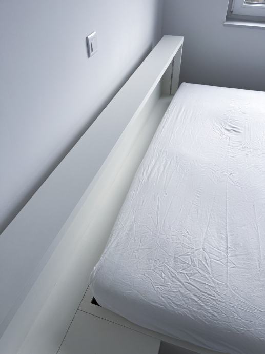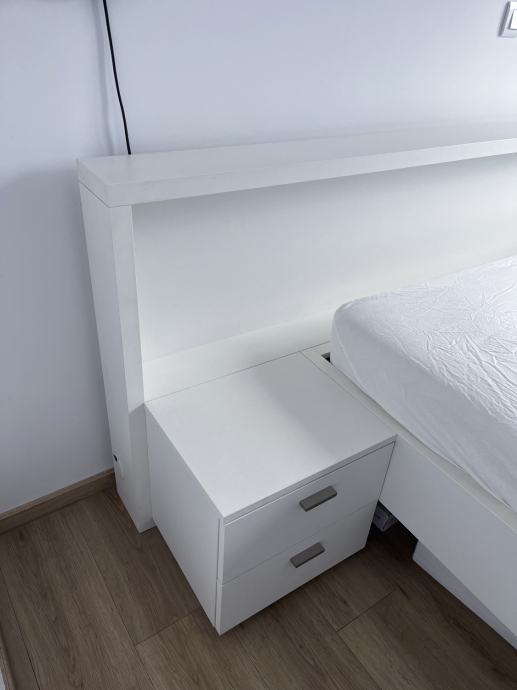 Na uzglavlju se nalazi ugrađena kanalica za LED rasvjetu. Madrac je veličine 200 x 180. Noćni ormarić montiran je na okvir kreveta i ima dvije identične ladice.