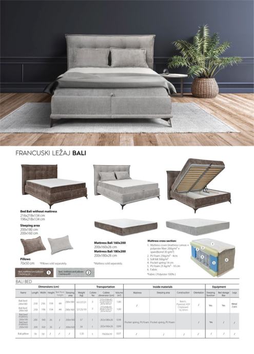 Proizvod suvremenog dizajna omogućava korisnicima da formiraju ambijent, koji je u skladu sa namijnom prostora, željenim izrazom i savremenim trendovima. Krevet Bali poseduje funkcionalnu kutiju za posteljinu velike zapremine, jedinstveno dizajnirano uzglavlje kao i podiznu latofleks podnicu sa čeličnim ramom.