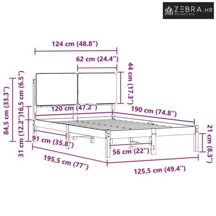 Veličina madraca: Mali dvostruki kratki (120 cm x 190 cm / 47" x 75")