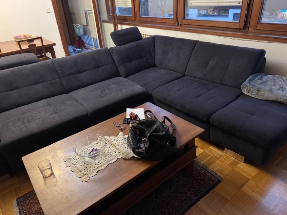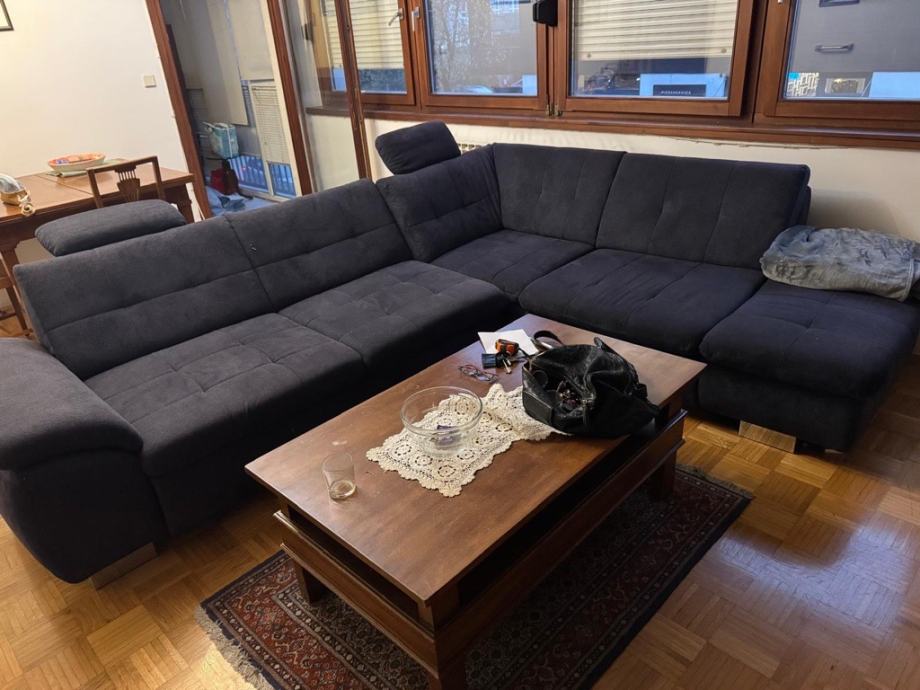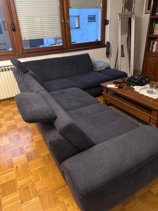 Prodajem veliku kutnu garnituru tamno plave boje, izuzetno udobnu i očuvanu. Garnitura ima podesive naslone za glavu i dovoljno mjesta za cijelu obitelj ili društvo. Tkanina je mekana, kvalitetna i laka za održavanje. Korištena je u kućnom prostoru, bez oštećenja.