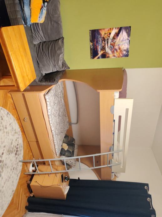 Izrazito velik, visok i udoban krevet na kat u jako dobrom stanju sa letvičastom podnicom i pripadajućim madracima. Odlična izrada, Lesnina. U podnožju se nalaze dvije velike izvlačne ladice u duljini i širini cijelog kreveta.