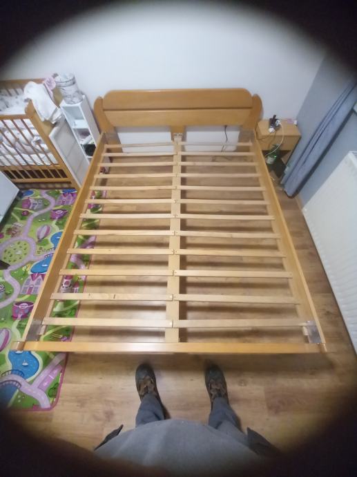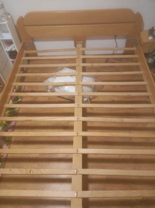 Prodajem masivni krevet sa podnicama od ciste bukve, krevet je star 5 godina,samo treba zamjeniti "L" profile, ima sitna ostecenja, dimenzija 160x200. Razlog prodaje kupnja novog francuskog lezaja. Cijena 100€, uvjet doci po njega