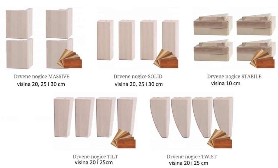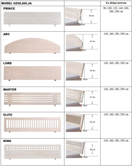 Mogućnost kombinacije raznih modela okvira kreveta, uzglavlja kreveta i nogica kreveta da dobijete krevet prema Vašim željama.