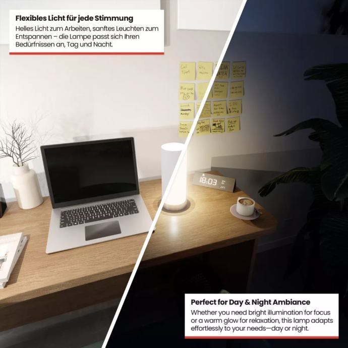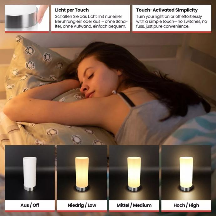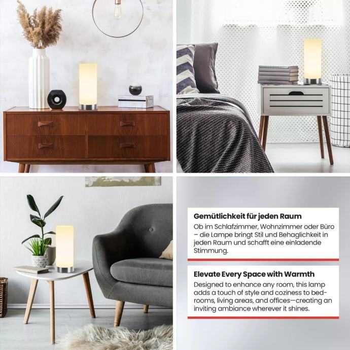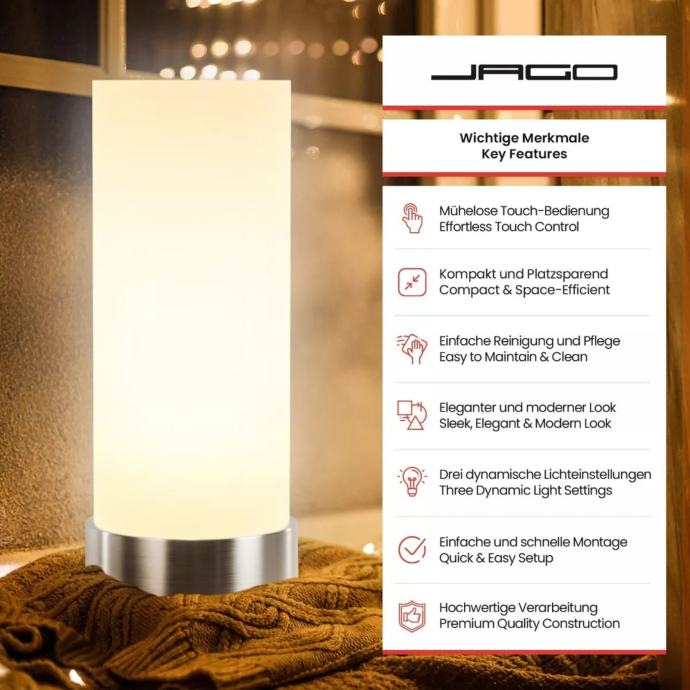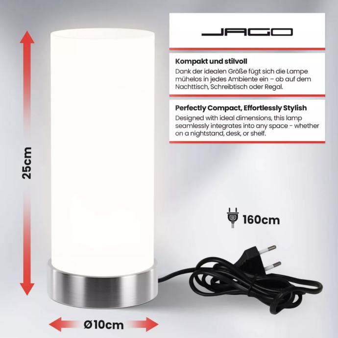 Stolna svjetiljka Touch s 3-stupanjskim prigušivačem Bezvremenski, moderan i minimalistički. Stolna lampa izrađena od stakla i metala pruža ugodno svjetlo i savršeno pristaje na noćni ormarić u spavaćoj sobi, komodu u dnevnoj sobi, policu u radnoj sobi ili na stol za blagovanje. Svjetlo se može pojedinačno kontrolirati putem senzora na dodir pomoću prigušivača. Postoje tri razine za odabir. Zahvaljujući jednostavnom dizajnu, stolna svjetiljka promjera približno deset centimetara je svestrana.