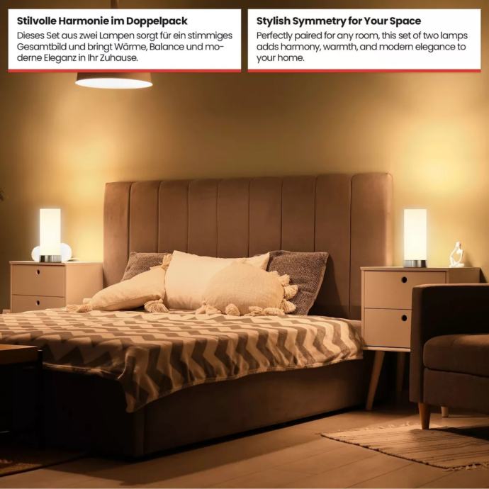 S praktičnim senzorom dodira, 3-stupanjska prigušivost. Moderan, skroman dizajn Idealan za police, noćne ormariće, ormare i još mnogo toga. Udoban izvor svjetla. Kompaktna veličina. Dostupno kao set od 1 ili 2. Dostupno kao set od 1 ili 2. Abažur (Ø): cca. 9,5 cm Ukupne dimenzije (Ø/H): cca. 10 / 25 cm Težina: 0,65 kg Duljina kabela: 160 cm Napon: 220-240 V / 50 Hz Utičnica: E14 Izvor svjetla: max. 40 W ili prigušiva LED lampa (nije uključena) Materijal: Baza: metal (niklano) Sjenilo: staklo Boja: bijela i srebrna