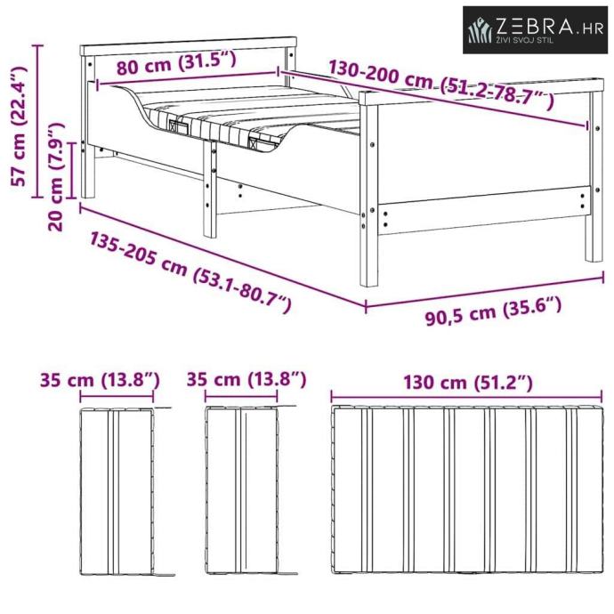 1 x Okvir kreveta: 205 x 90,5 x 57 cm (DxŠxV)