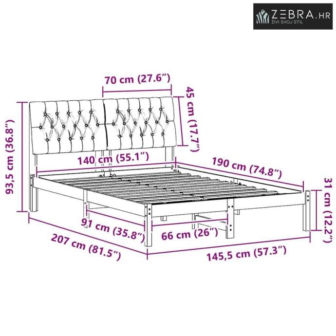 Materijali i završna obrada: Okvir kreveta je od masivnog bora, što mu daje dugotrajnost i čvrstoću. Lakirana površina dodatno ga štiti i naglašava prirodnu ljepotu drveta. Ovaj odabir poboljšava izgled kreveta, nudeći bezvremenski i svestran stil koji lako pristaje raznim interijerima.