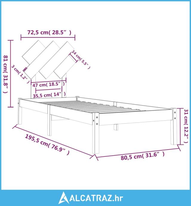 - Dimenzije okvira za krevet: 195,5 x 80,5 x 31 cm (D x Š x V)