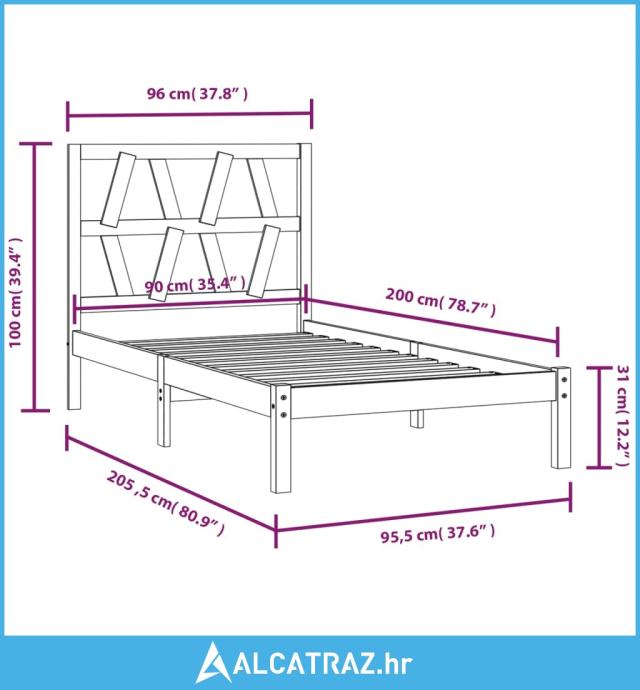 - Dimenzije okvira za krevet: 205,5 x 95,5 x 31 cm (D x Š x V)
