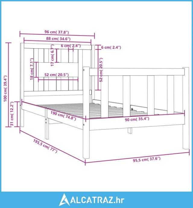 - Ovaj okvir kreveta prikladan je za madrac dimenzija 90 x 190 cm (jednokrevetni 3FT).