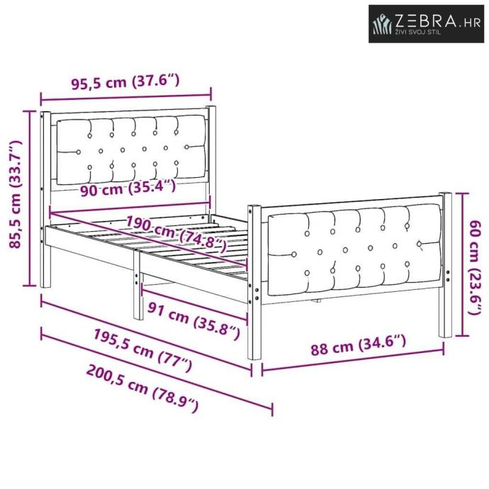 Veličina madraca: Kratki jednostruki (90 cm x 190 cm / 35" x 75")