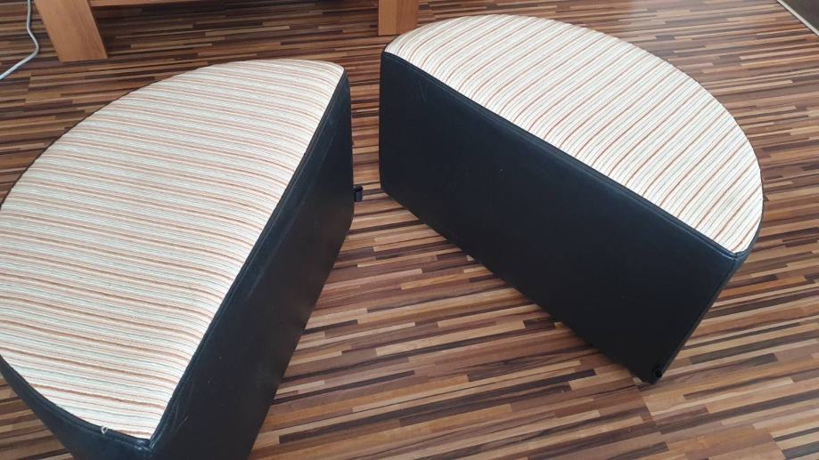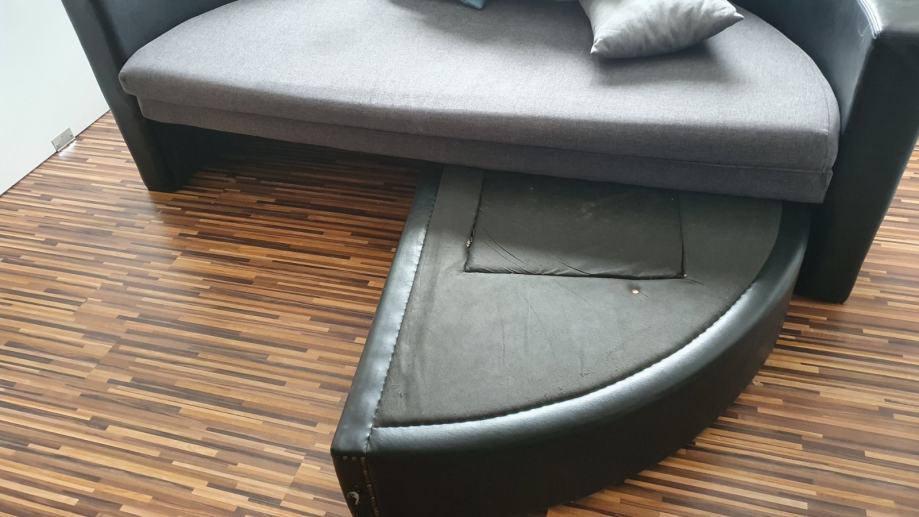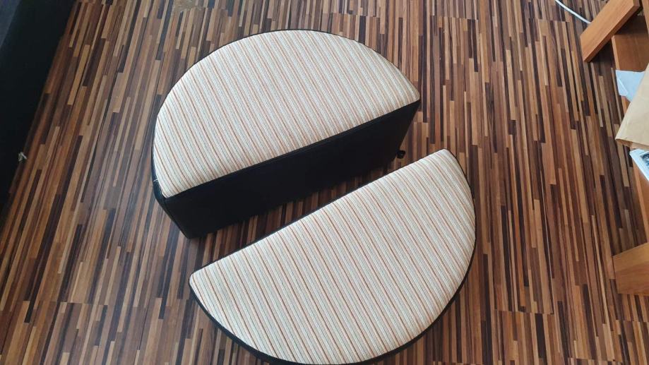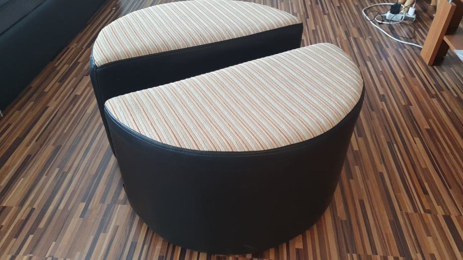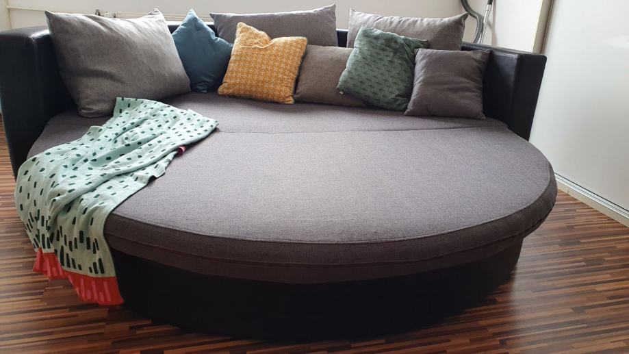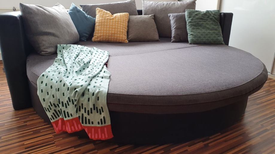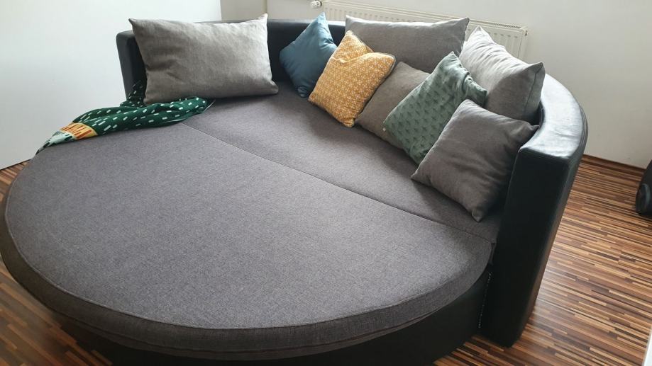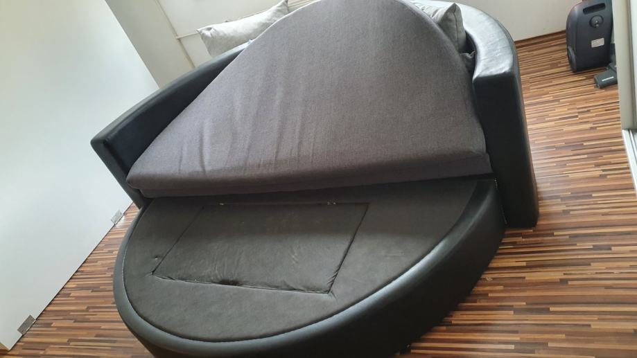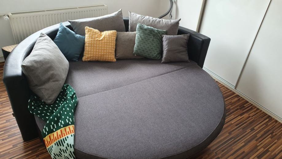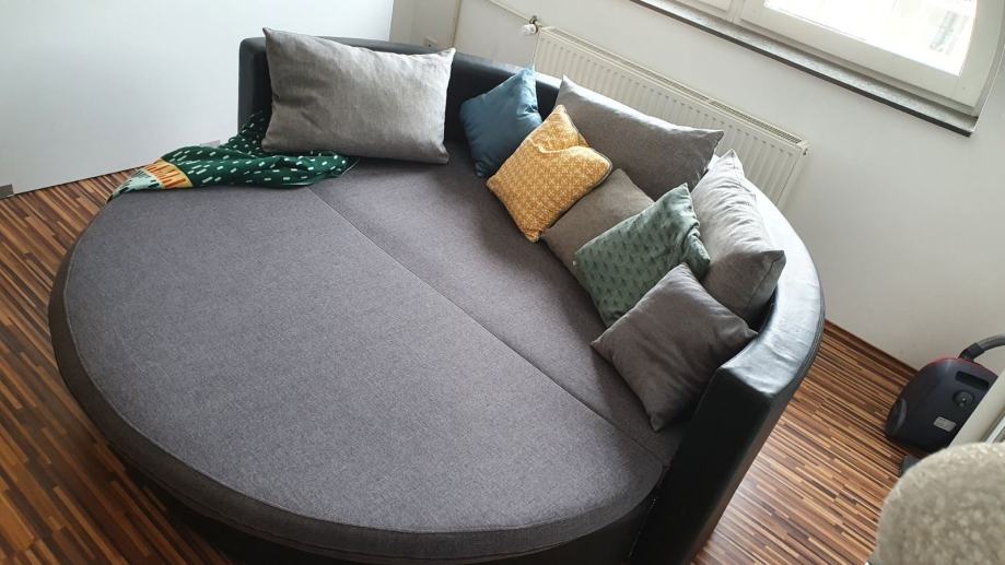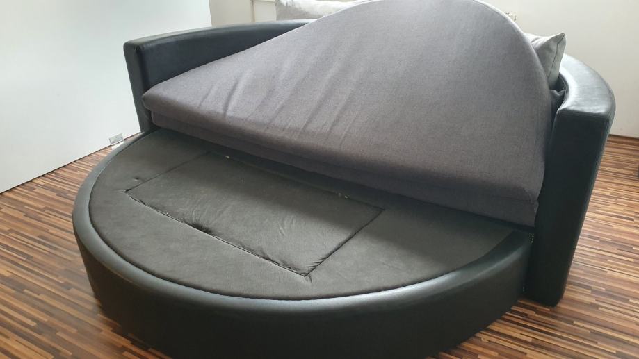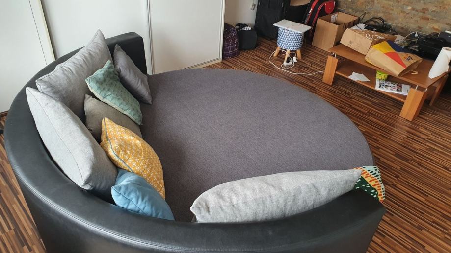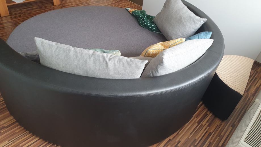 Prodajem okrugli krevet + dva taburea. Promjer kreveta 230cm.Krevet kombinacija crno/sive boje -jedno ostecenje na njemu(zasebna slika) . Inace je krevet kao nov.