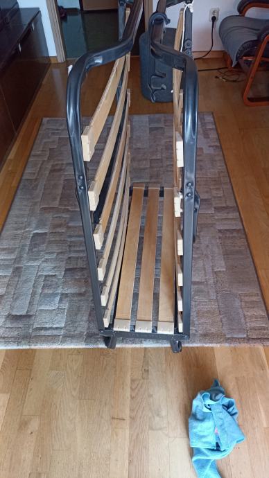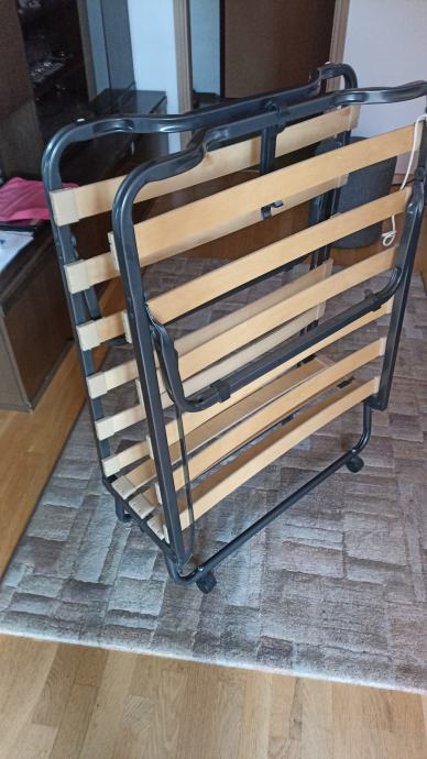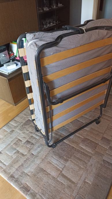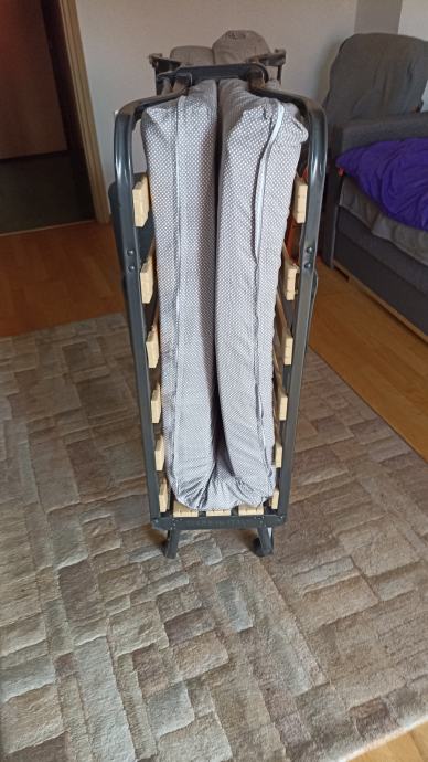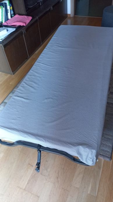 Nekorišten sklopiv metalni krevet s madracem. Uključena i zaštitna pamučna navlaka za madrac sa ciferšlusom.