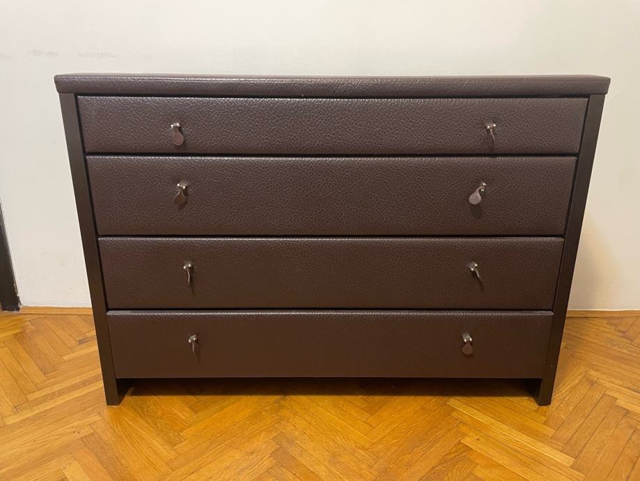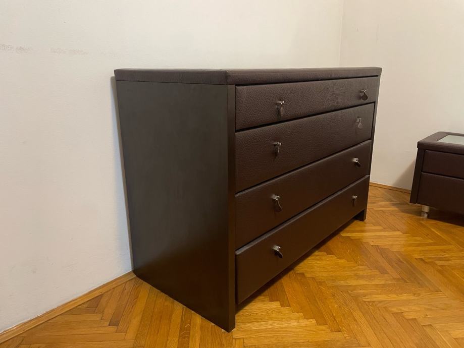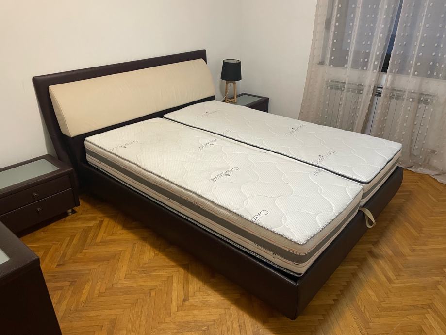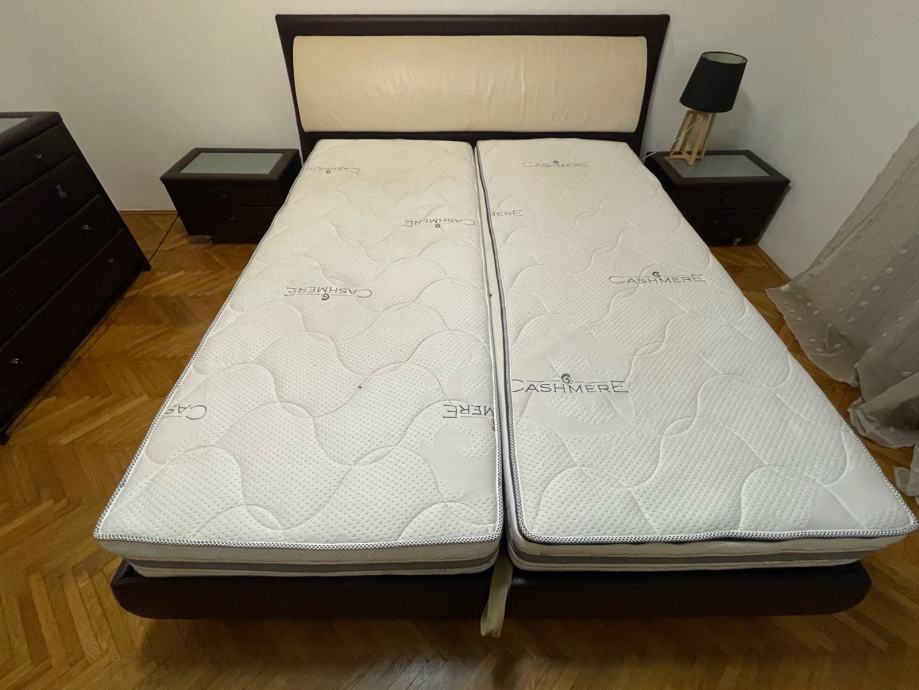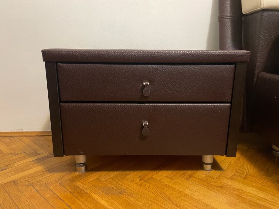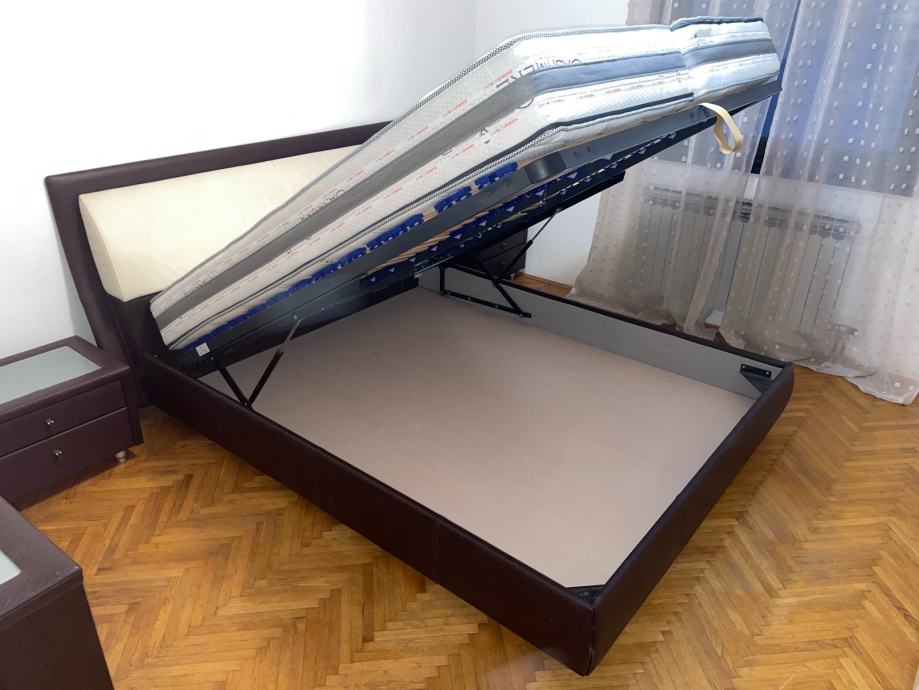 Kvalitetni krevet sa spremnikom i Perfecta Dreams madracima. Komoda s ladicama dimenzija 110x78x50. Dva noćna ormarića dimenzija 60x40x60. Dva taburea dimenzija 45x45x48. Stanje ko novo.
