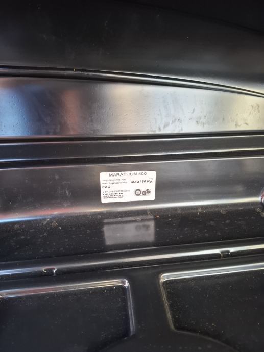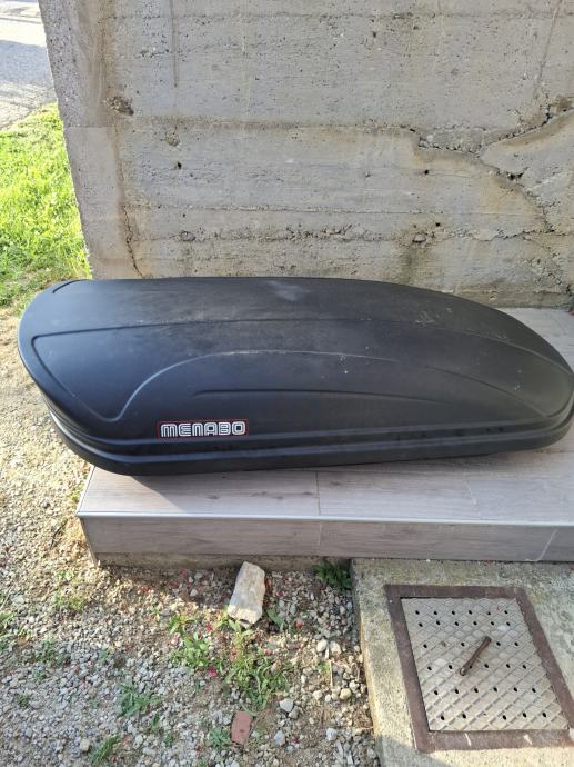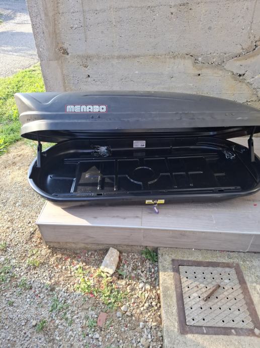 Krovna kutija Menabo Marathon 400 litara. Korištena tri puta samo za odlazak na ljetovanje. Prodajem jer je premala. Dimenzije 165x80x40.