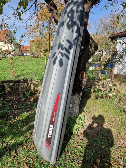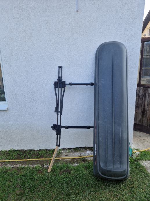 Prodajem krovni poprečni nosač (univerzalan) sa čeljustima za montažu na kojem su ugrađeni kutija Polar 500 THULE,nosač za skije,nosač za bicikl.