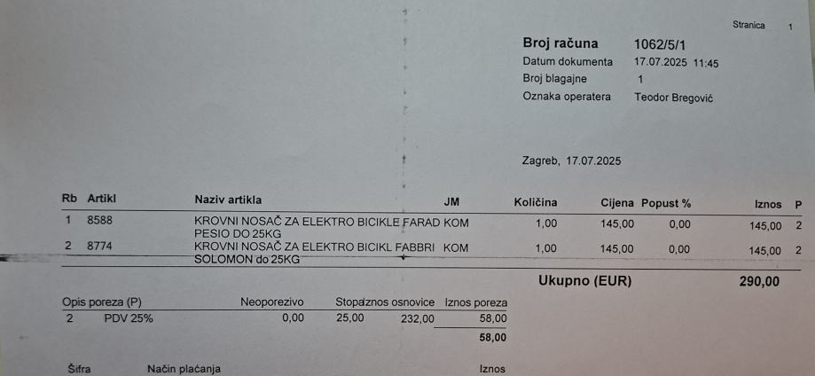 Prodajem potpuno nove nosače bicikala korištene svega 2 puta. FARAD PESIO i FABBRI SOLOMON sa povečanom nosivosti do 25kg. Korišteno za e-bike, montaža vrlo brza i jednostavna. Ključ za sigurnost.Posjedujem i račun, pod garancijom. Prodajem radi promjene auta. Poprečni alu krovni nosači MENABO - GRATIS!!!