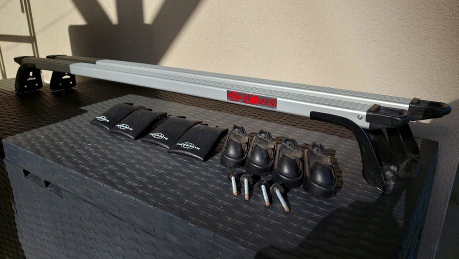 "SuperAuto" univerzalni aluminijski krovni nosači za vozila sa sistemom FixPoint (4 rupe u krovu). Komplet za montažu s vijcima M6. Podešavajuća širina.