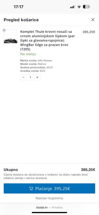 Krovni nosaci Thule za Alfu Romeo Stelvio. Koristeni 2 x tjedan dana. Wing Bar Edge sa aluminijskim sipkama u mat crnoj boji. Kao novi, u odlicnom stanju. Cijena novih 395 eura.