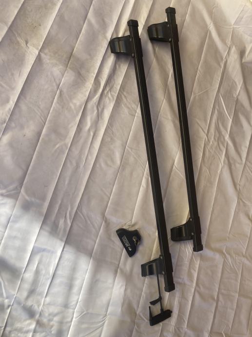 Original Thule krovni nosači, kao novi, korišteni samo 2 tjedna. Oznaka 404. Nosivost 75kg/prečki. Potpuno ispravne bravice sa 3 ključića.U kompletu i moment zatezni ključ.