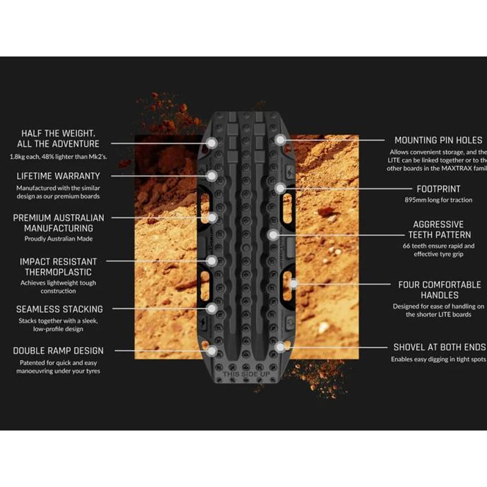 Front Runner MaxTrax Lite podnice so namenjene reševanju vašega vozila iz peska, blata in snega. S svojo nazobčano površino zagotavljajo odličen oprijem pnevmatike. Njihova dolžina pripomore k njihovi lahki teži, kar pomeni enostavnejše rokovanje in shranjevanje.